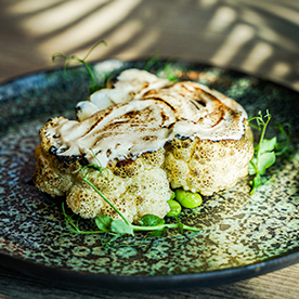 Cauliflower, spices marinade, vegan béarnaise, edamame, spinach salad, dill oil