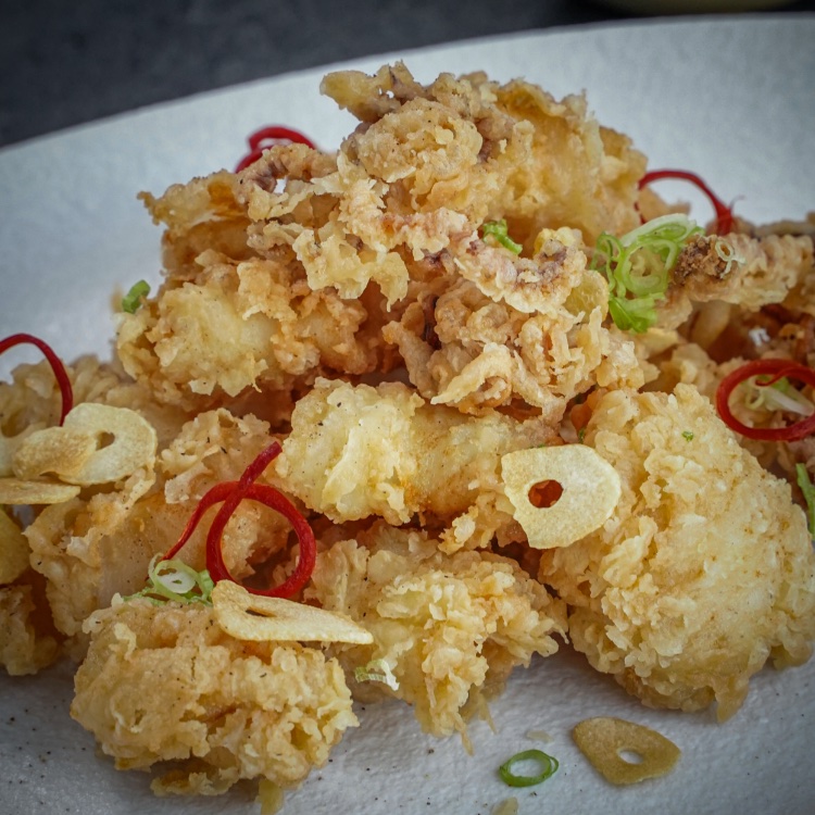 Calamari, katakuriko, garlic, curly red chili, Thai dip, crispy garlic