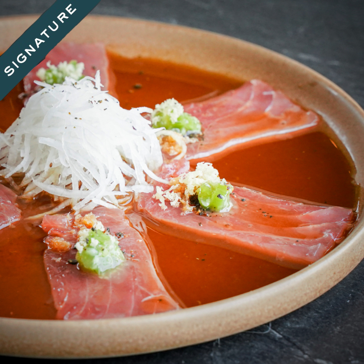 Yellowfin tuna tataki, homemade aji Amarillo sauce, orange valencia, rice cracker & chives (medium spicy)